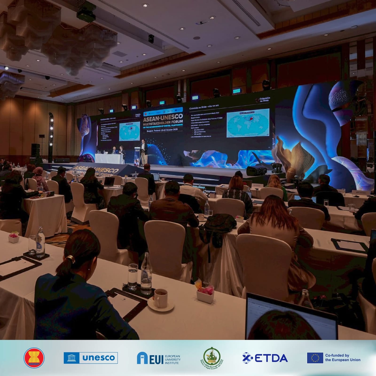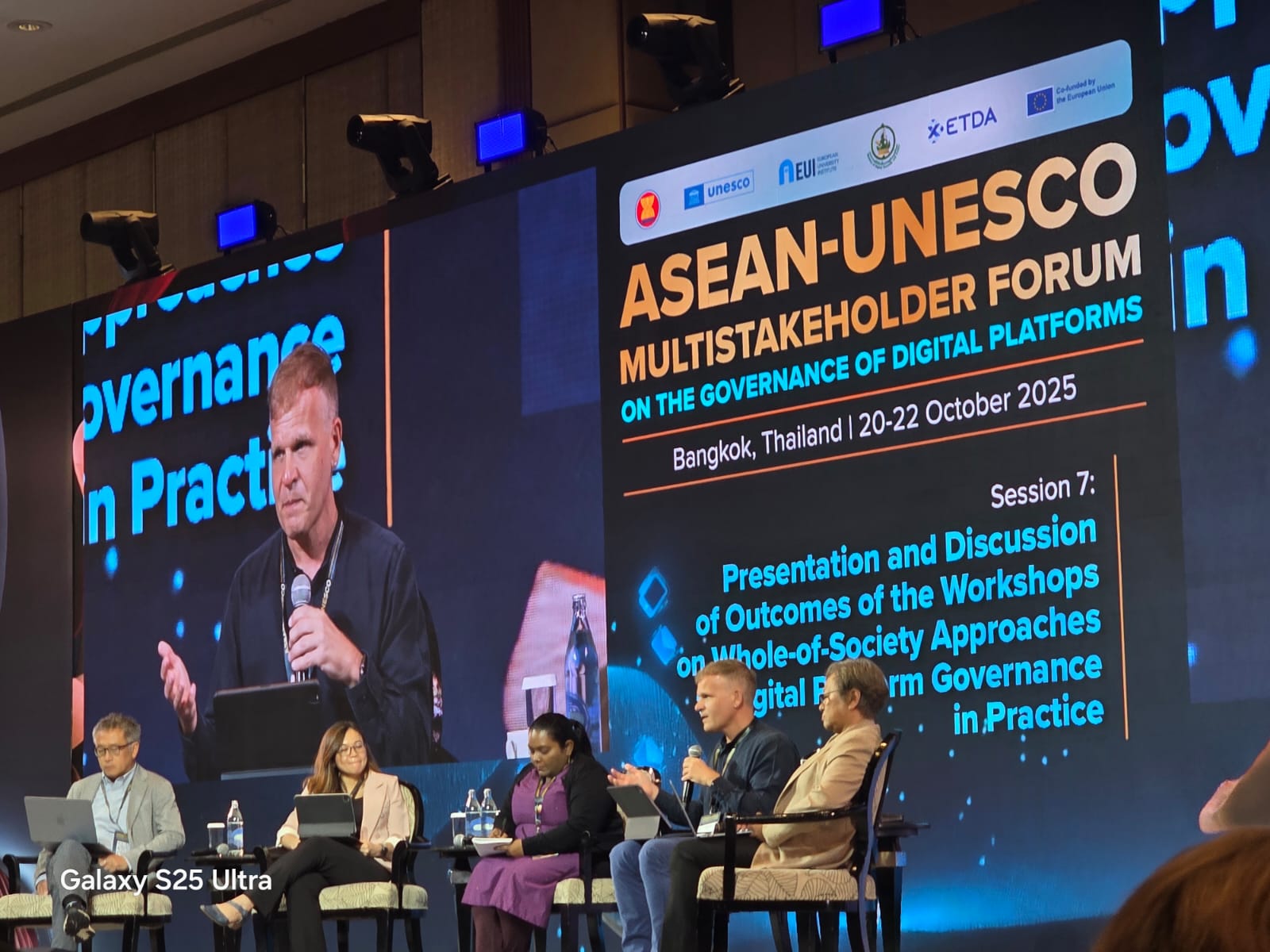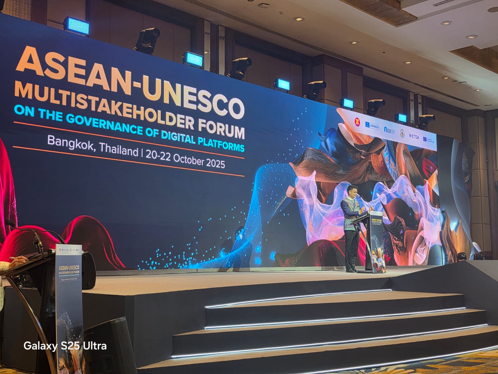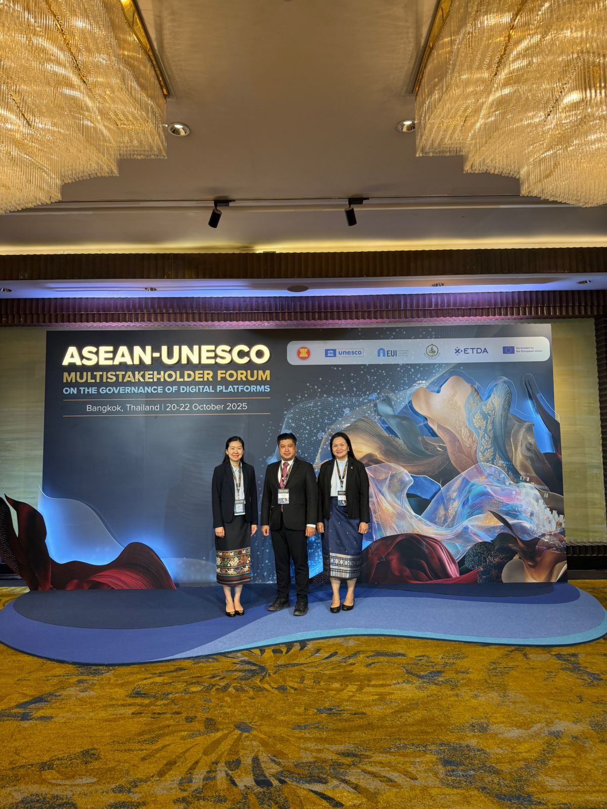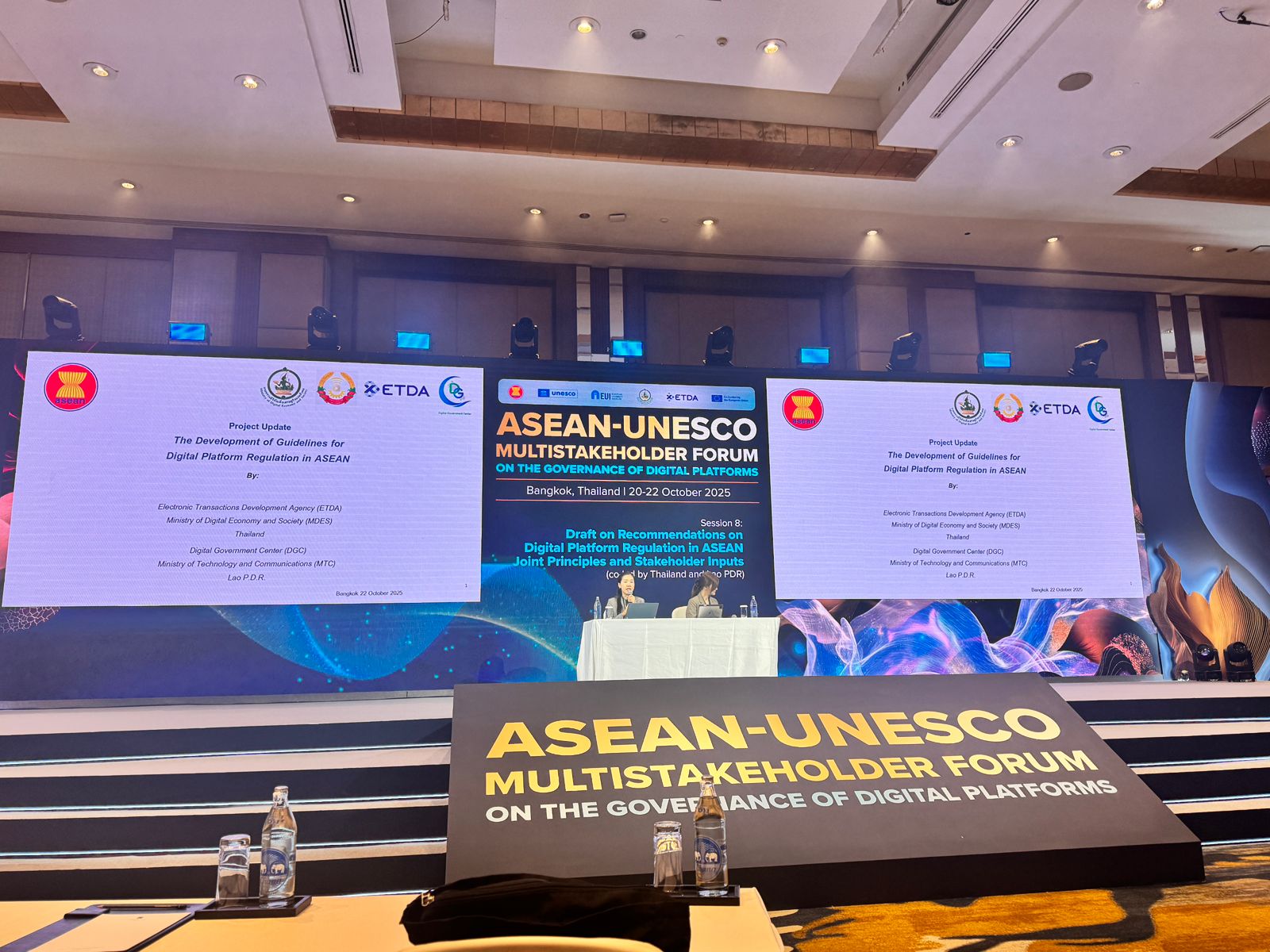 ຄະນະສູນບໍລິຫານລັດດິຈິຕອນ ກະຊວງ ຕສ ພ້ອມທັງ ຄະນະຜູ້ແທນ ສປປ ລາວ ເຂົ້າຮ່ວມກອງປະຊຸມວິຊາການສາກົນ ໃນການຄຸ້ມຄອງພຣາດຟອມ ລະຫວ່າງ ອາຊຽນ ແລະ ອົງການອຸຍເນັສໂກ “ASEAN–UNESCO Multistakeholder Forum on the Governance of Digital Platforms” ເຊິ່ງຈັດຂຶ້ນໃນວັນທີ 20 ຕຸລາ 2025 ທີ່ບາງກອກ, ປະເທດໄທ.
