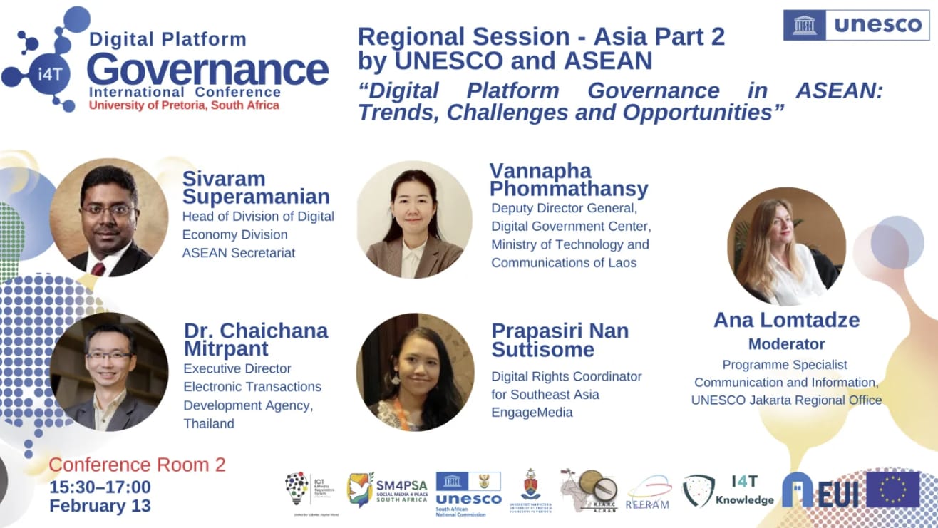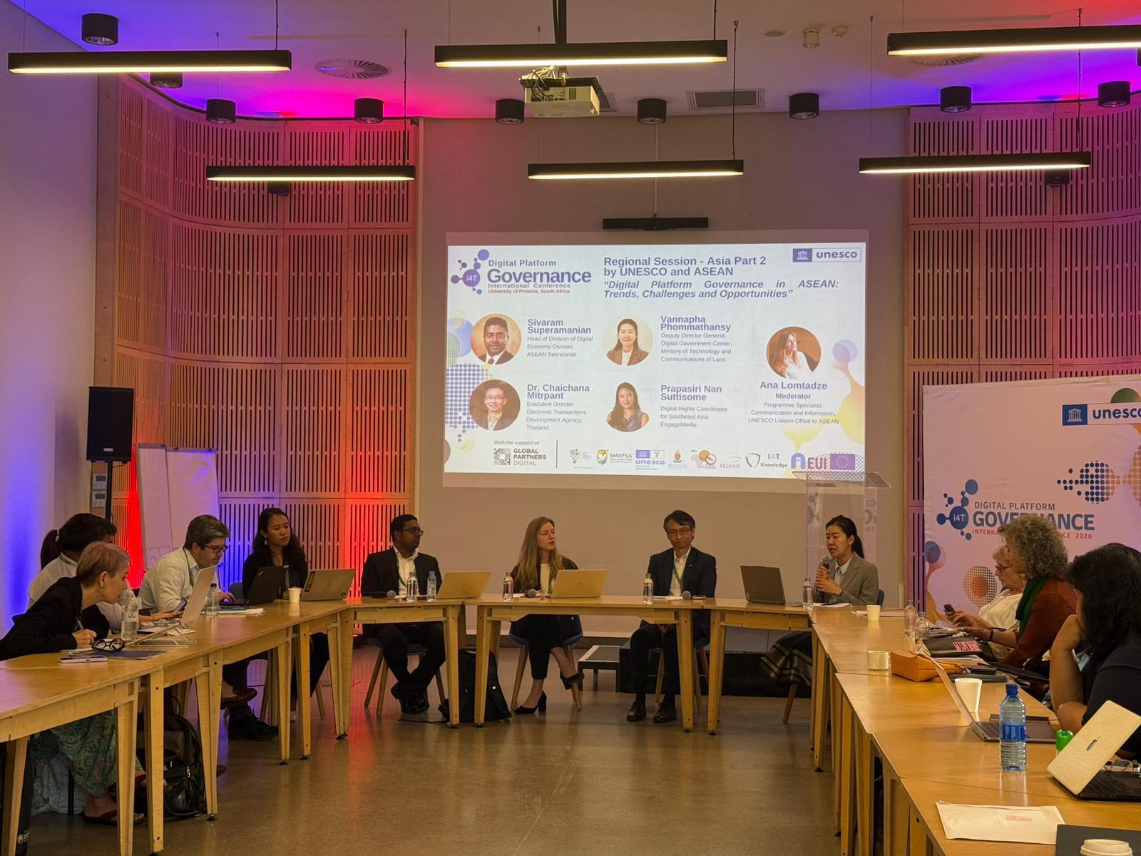 ກອງປະຊຸມນານາຊາດວ່າດ້ວຍການຄຸ້ມຄອງພຣາດຟອມດິຈິຕອນ ຄັ້ງນີ້, ໄດ້ຈັດຂຶ້ນເປັນຄັ້ງທີ 02 ພາຍໃຕ້ການສະໜັບສະໜູນຂອງ UNESCO ໂດຍມີຈຸດປະສົງຫຼັກເພື່ອຊຸກຍູ້ສົ່ງເສີມການຄຸ້ມຄອງພຣາດຟອມດິຈິຕອນ ແລະ ທົບທວນຄືນຄວາມຄືບໜ້າຂອງຄູ່ມືການຄຸ້ມຄອງ ພຣາດຟອມ (UNESCO Guidelines for the governance of digital platform). ໃນມື້ທີສອງຂອງການປະຊຸມ, ອາຊຽນ ແລະ UESCO ໄດ້ຈັດເວທີເສວະນາ ເຜີຍແຜ່ ບົດສຶກສາ ແລະ ຄູ່ມືລະບຽບການໃນການພັດທະນາພຣາດຟອມດິຈິຕອນ ຂອງ ອາຊຽນ (Asean Guideline on Digital Platform Regulation. ຊື່ງ ທ່ານ ນ. ວັນນະພາ ພົມມະທັນສີ, ຮອງຫົວໜ້າສູນບໍລິຫານລັດດິຈິຕອນ ໄດ້ ຕາງໜ້າ ກະຊວງ ເຕັກໂນໂລຊີ ແລະ ການສື່ສານ, ສປປ ລາວ (ໃນນາມທີ່ເປັນ ປະເທດຄູ່ຮ່ວມຈັດຕັ້ງປະຕິບັດກິດຈະກໍາ ອາຊຽນ 2025) ຮ່ວມກັບ ຫົວໜ້າພະແນກໄອຊີທີ, ສໍານັກງານ ກອງເລຂາທິການອາຊຽນ, ຜູ້ອໍານວຍການ ສໍານັກງານພັດທະນາທຸລະກໍາທາງເອເລັກໂຕຣນິກ ປະເທດໄທ (ETDA ) ແລະ ຜູ້ຕາງໜ້າຈາກອົງການສັງຄົມສາກົນ (Civil Society) ສົນທະນາ ແນວທາງການຈັດຕັ້ງປະຕິບັດທີ່ເປັນຮູບປະທໍາສໍາລັບອາຊຽນໃນການຄຸ້ມຄອງບັັນດາພຣາດຟອມດິຈິຕອນ ໃຫ້ເກີດຄວາມໜ້າເຊື່ອຖື ແລະ ມີຄວາມຍືນຍົງໃນອະນາຄົດ.